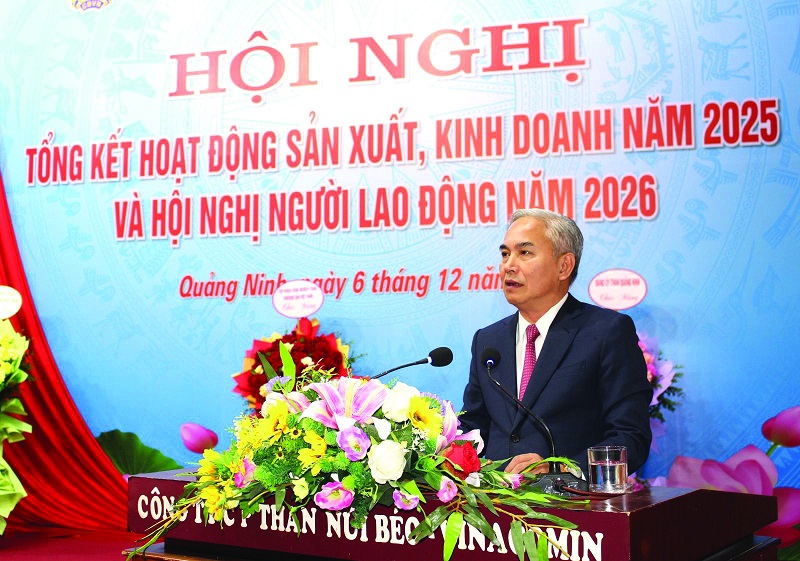Tổng giám đốc Tập đoàn Vũ Anh Tuấn ghi nhận, biểu dương kết quả, thành tích đạt được năm 2025 của Than Núi Béo và phát biểu chỉ đạo.