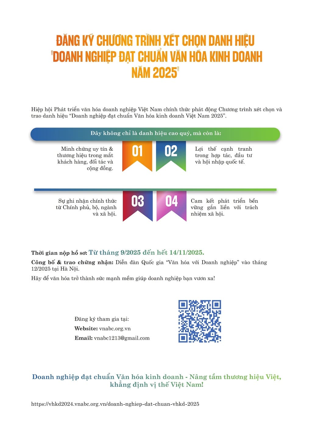 Đăng ký tham gia tại: Website: vnabc.org.vn – Email: vnabc1213@gmail.com Link: https://vhkd2024.vnabc.org.vn/doanh-nghiep-dat-chuan-vhkd-2025 Theo Tạp chí in VHDNVN tháng 10/2025