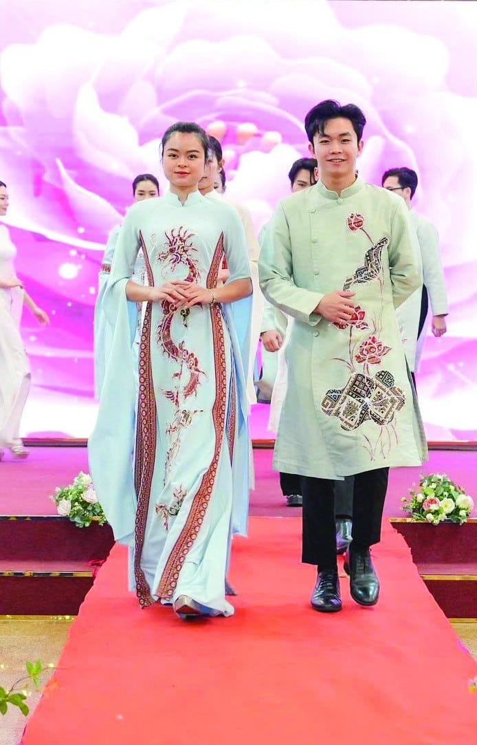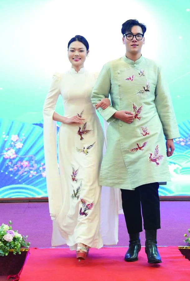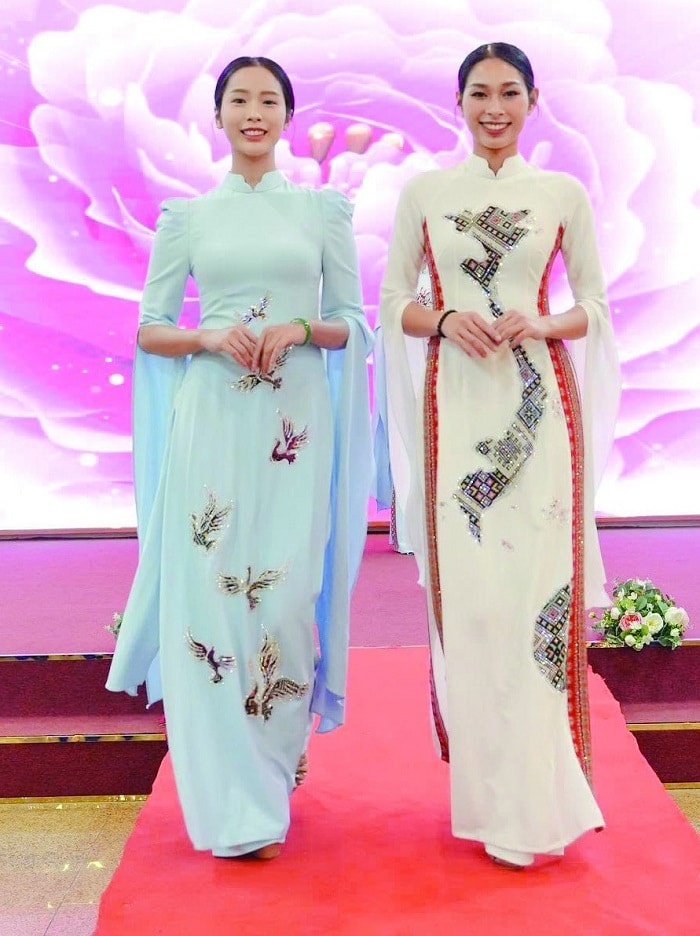 BST Vì Hòa Bình gồm hơn 30 mẫu áo dài cách tân, sử dụng hai gam màu chủ đạo trắng – xanh, tượng trưng cho sự thanh khiết và bình yên. Trên nền chất liệu mềm mại, các họa tiết rồng, phượng, hoa sen, chim bồ câu, bản đồ Việt Nam… và thổ cẩm được xử lý theo phong cách đương đại: Rồng biểu trưng sức mạnh dân tộc. Phượng tượng trưng cho vẻ đẹp và sự thịnh vượng. Hoa sen đại diện cho văn hóa Việt, sự thanh cao. Chim bồ câu biểu tượng toàn cầu của hòa bình, mang ý nghĩa về tự do, thuần khiết và khát vọng sống trong an lành, đoàn kết. Bản đồ Việt Nam khẳng định chủ quyền lãnh thổ. Thổ cẩm, được đắp thêu thủ công, gửi gắm thông điệp về cội nguồn.