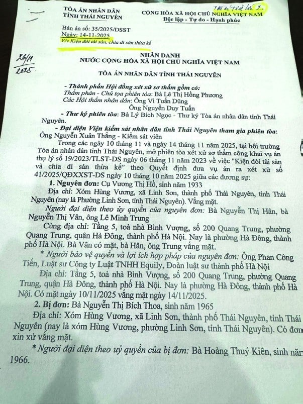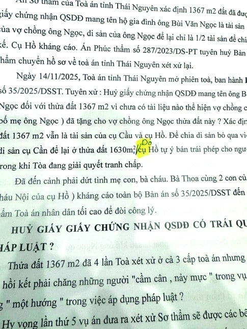 Ngày 14/11/2025, Toà án tỉnh Thái Nguyên mở phiên toà, ban hành Bản án số 35/2025/DSST, tuyên xử: Huỷ giấy chứng nhận QSDĐ mang tên ông Bùi Văn Ngọc đối với thửa đất 1367 m2 vì chưa có tài liệu nào thể hiện vợ chồng cụ Hồ (bố mẹ ông Ngọc) đã tặng cho vợ chồng ông Ngọc thửa đất này? Xác định thửa đất 1367m2 vẫn là tài sản của cụ Cầu và cụ Hồ. Để chia di sản bỏ qua việc chia di sản cụ Cầu để lại ở thửa đất 1630m2, do cụ Hồ tự ý bán trái phép cho người khác trong khi Tòa đang giải quyết tranh chấp.