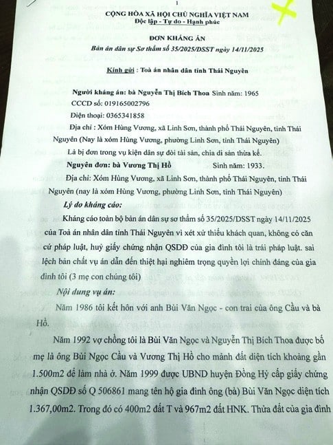 Đã đến cảnh phải dứt tình mẹ con, bà cháu. Bà Thoa cùng 2 con của mình (cháu nội của cụ Hồ) kháng cáo toàn bộ Bản án số 35/2025/DSST đến toà phúc thẩm Toà án nhân dân tối cao để đòi công lý.