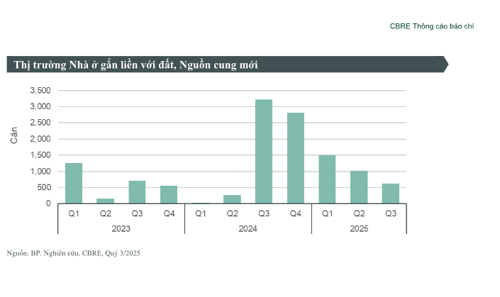 Tổng lượng giao dịch thị trường BĐS gắn liền với đất trong quý III/2025 đạt gần 640 căn, vượt mức mở bán mới cùng kỳ. Điều này cho thấy nhu cầu thực tế đối với sản phẩm nhà đất vẫn hiện hữu và được người mua nhà ưa chuộng.