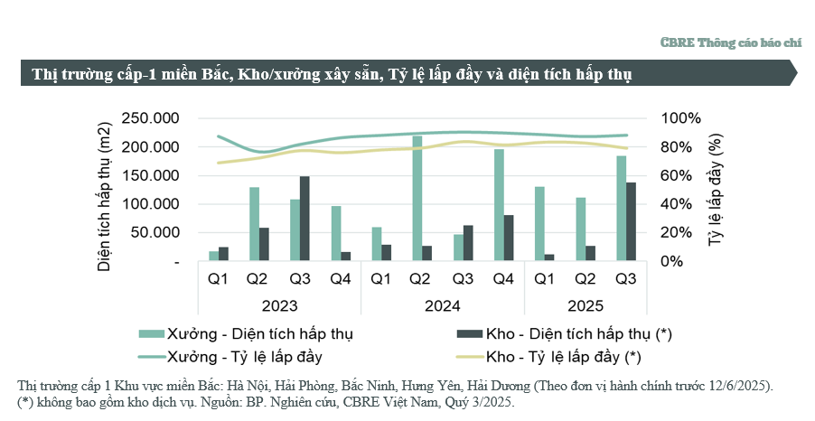 Đối với phân khúc kho xưởng xây sẵn, thị trường cấp 1 khu vực miền Bắc ghi nhận khoảng 0,8 triệu m2 nguồn cung mới đi vào hoạt động trong 9 tháng năm 2025 – vượt tổng nguồn cung mới của cả năm 2024. Dự kiến, tổng nguồn cung mới trong cả năm 2025 tại khu vực này sẽ vượt mốc 1 triệu m2 – mức cao nhất kể từ khi thị trường kho xưởng xây sẵn bắt đầu phát triển tại miền Bắc. Trước áp lực nguồn cung tăng mạnh, tỷ lệ lấp đầy trung bình tại các tỉnh thành cấp 1 miền Bắc giảm nhẹ, đạt 79,3% đối với nhà kho xây sẵn (giảm 4,7 đpt theo năm) và 88,4% đối với nhà xưởng xây sẵn (giảm 2,2 đpt theo năm). Tuy nhiên, diện tích hấp thụ của cả hai phân khúc vẫn ghi nhận mức tăng trưởng ấn tượng, với tổng diện tích hấp thụ ròng đạt 0,6 triệu m2 trong 9 tháng – tăng 36,4% so với cùng kỳ năm trước. Về giá thuê, mặt bằng giá trung bình tại các tỉnh thành cấp 1 đạt khoảng 4,9 USD/m2/tháng đối với nhà kho xây sẵn và 5,0 USD/m2/tháng đối với nhà xưởng xây sẵn, tương ứng tăng 6,4% và 2,5% theo năm. Về nhu cầu, thị trường ghi nhận các giao dịch thuê lớn đến từ các doanh nghiệp sản xuất điện tử và thiết bị thể thao, trong khi các công ty logistics tiếp tục là nhóm khách thuê chủ lực của phân khúc nhà kho xây sẵn tại miền Bắc.